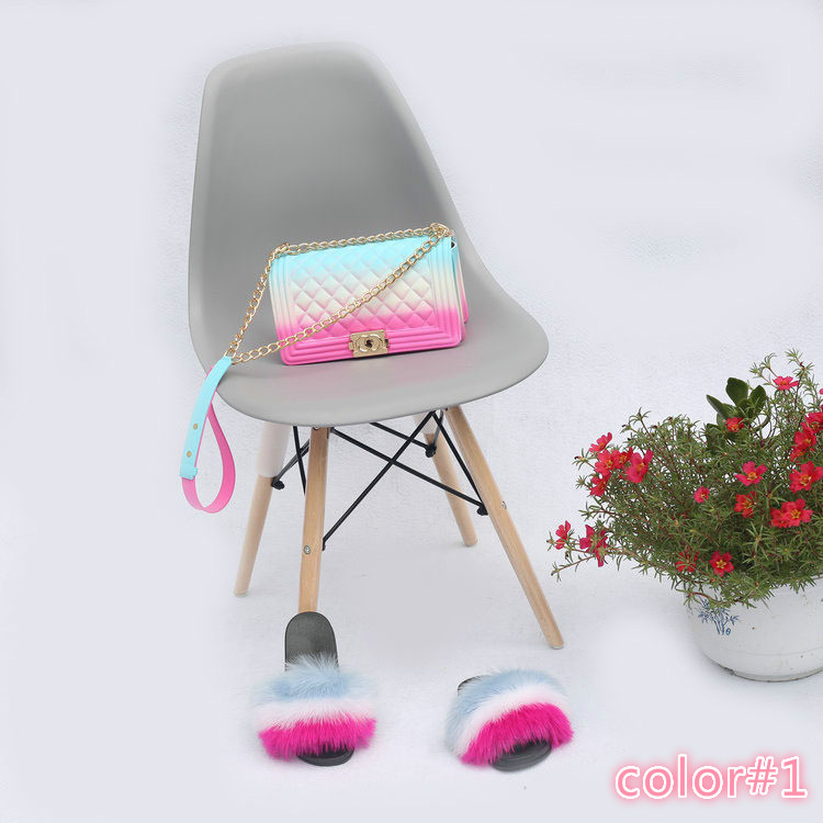 Fashion Fox Fur Slides Sandals for Women Furry Slippers Furry Crossbody Sets Jelly Rainbow Handbags Purses Style #2
