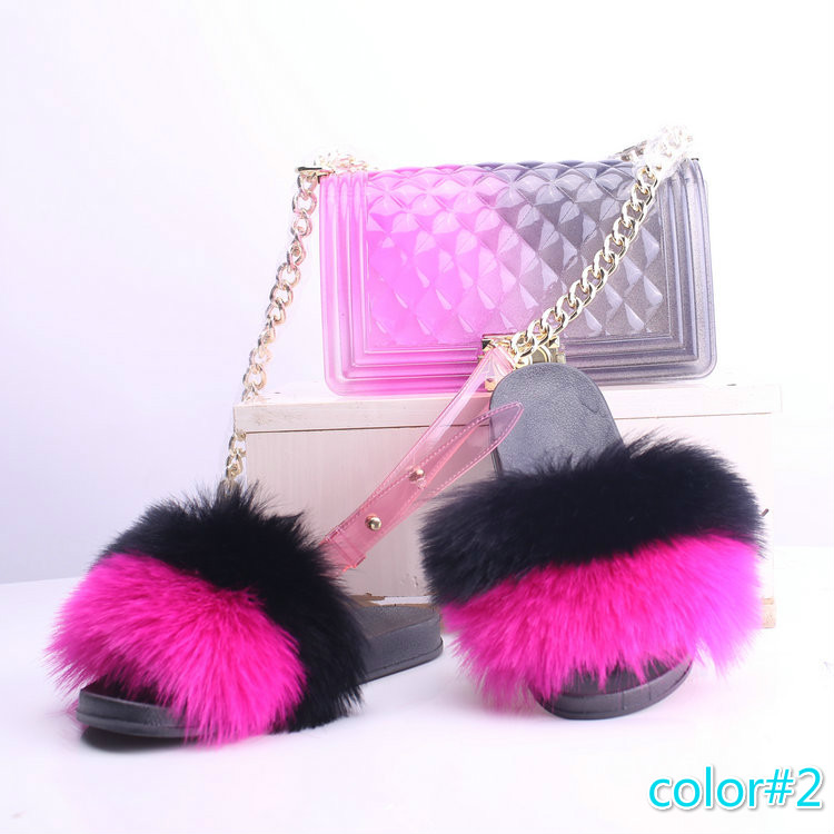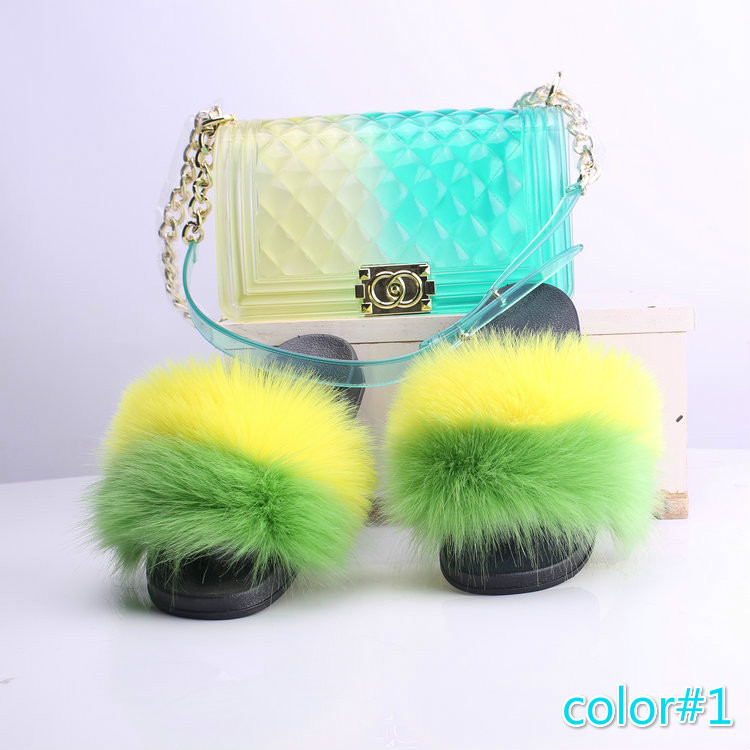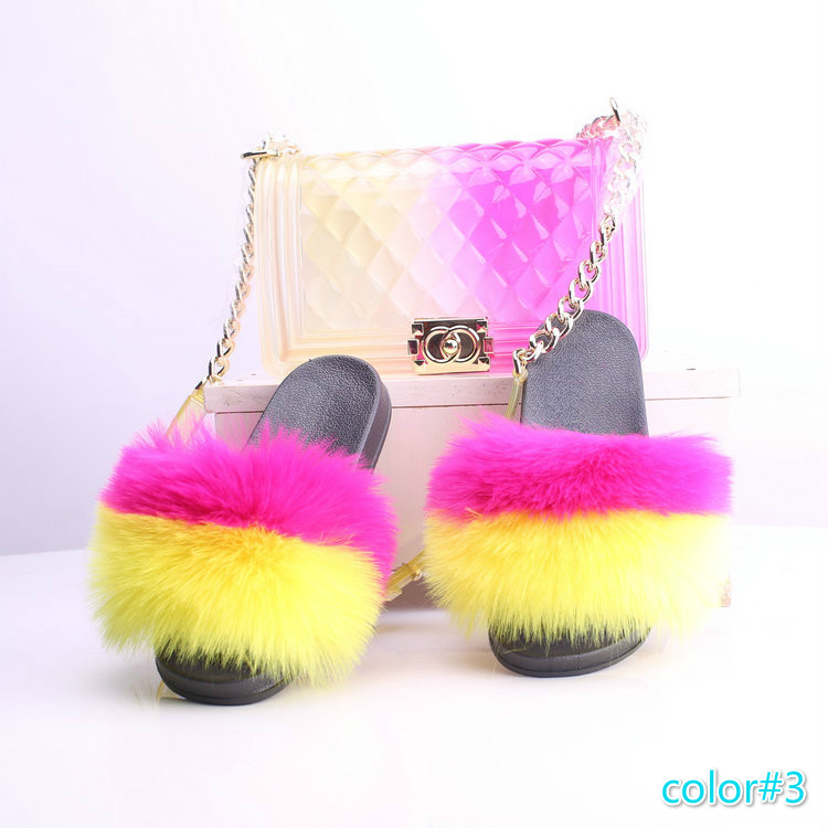 Fashion Fox Fur Slides Sandals for Women Furry Slippers Furry Crossbody Sets Jelly Rainbow Handbags Purses Style #3