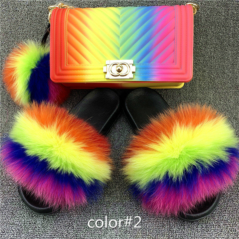 Fashion Fox Fur Slides Sandals for Women Furry Slippers Furry Crossbody Sets Jelly Rainbow Handbags Purses Style #4