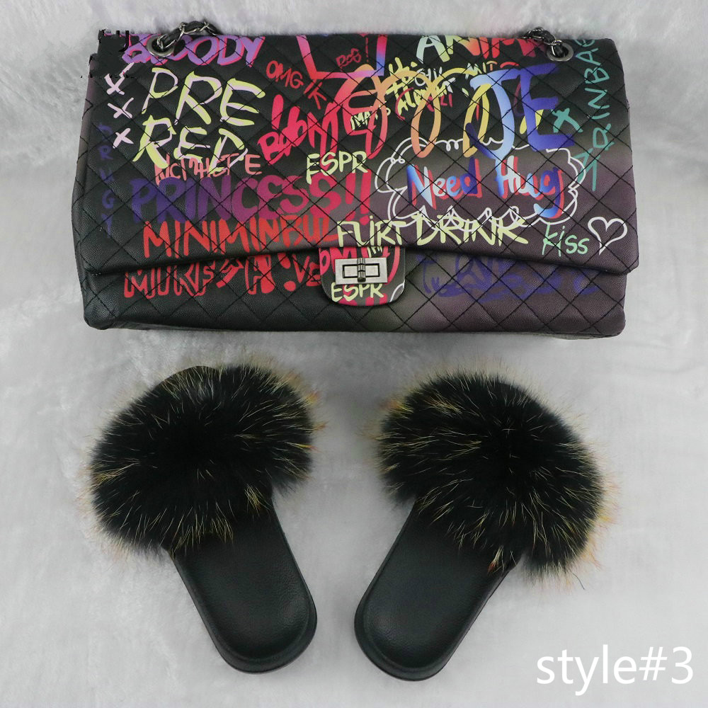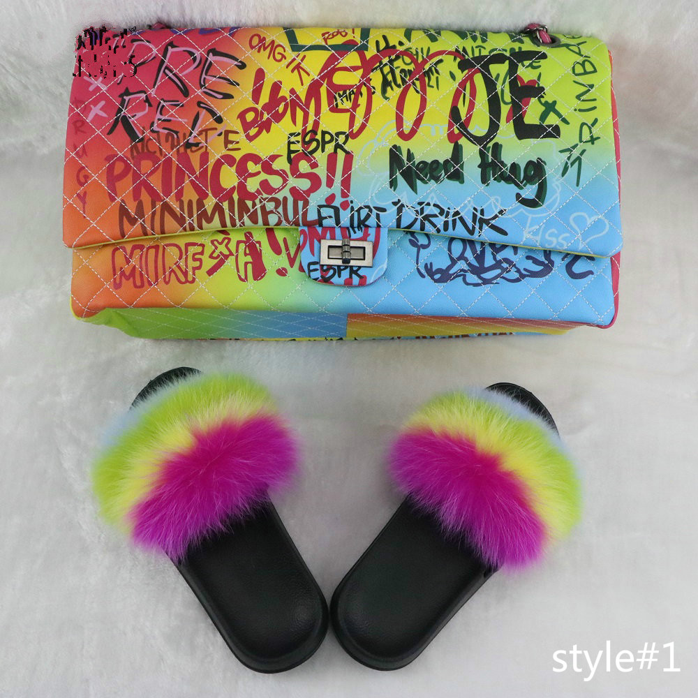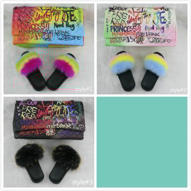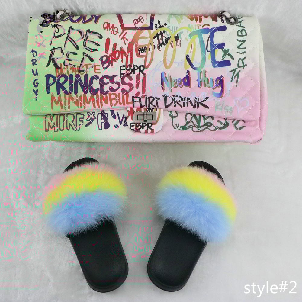 Painting Graffiti Handbags Purses Chain Bag Rainbow Fox Fur Slides Furry Slippers C2