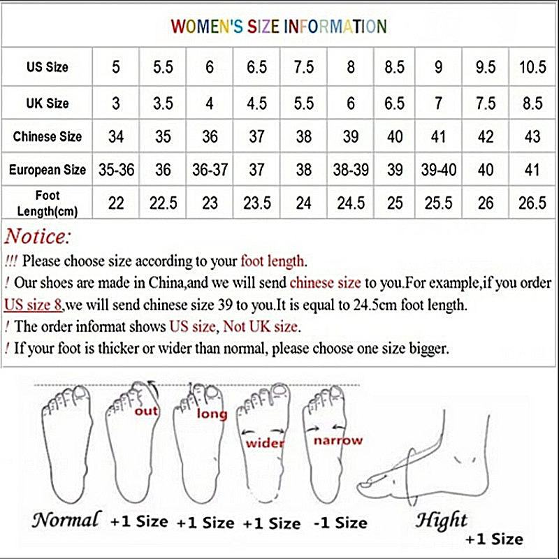 Please do measure your feet length first and then choose your shoes size according to our Size Chart.