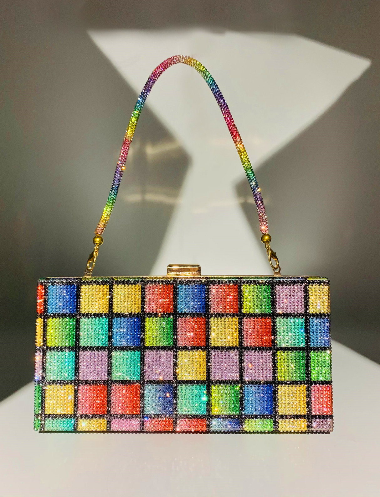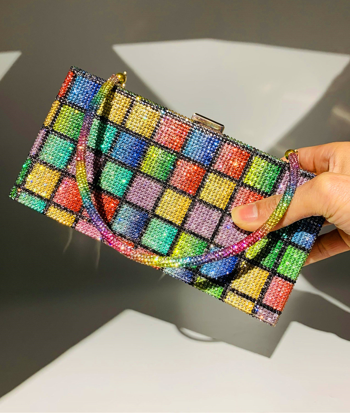 Shining Rhinestone Colorful Clutch Bags Grid Rainbow Evening Handbags for Women