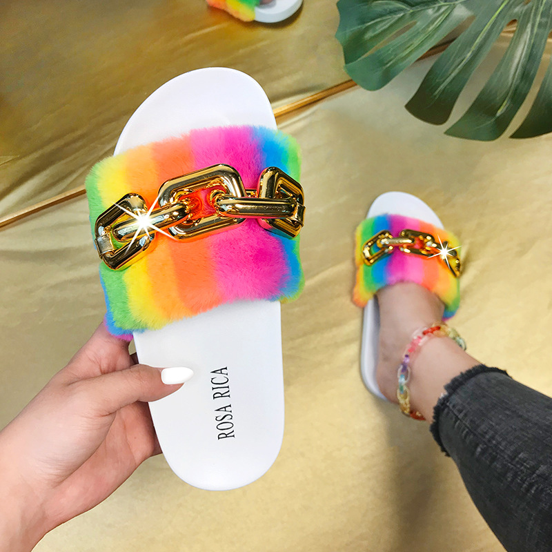 Trendy Rainbow Fur Chain Flat Sandals Large Size Slippers for Women